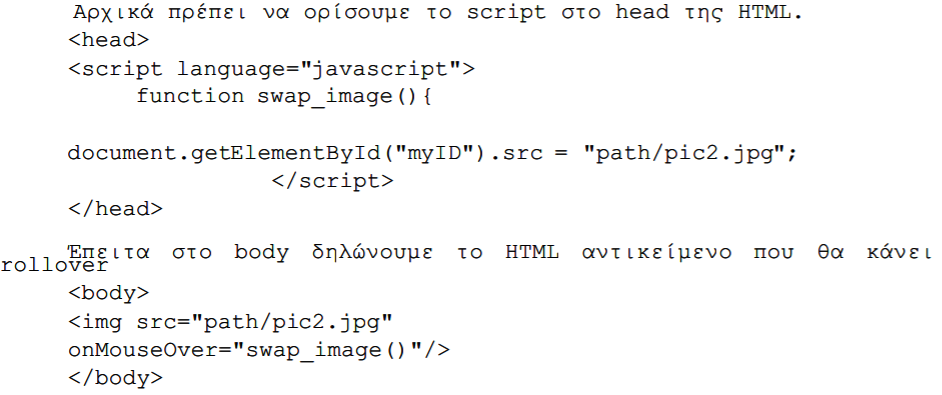 116. Διατυπώστε τη συνάρτηση swap_image() σε Javascript που δέχεται ως ορίσματα α) το id του αντικειμένου που θέλουμε να διαχειριστούμε και β) το path της εικόνας "pic2.jpg" που θα χρησιμοποιήσουμε ως rollover image. Προσδιορίστε τι είναι το HTML αντικείμενο που καλεί τη συνάρτηση.